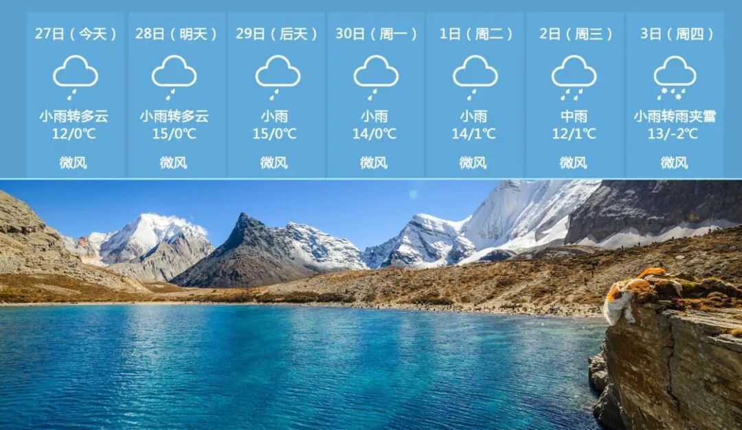 下周天气预报 下周稻城亚丁的天气还是多以小雨为主,温度在-2℃到15℃之间。最近稻城亚丁雨水会相对较多,而2018龙腾亚丁天空跑也将在明天开幕了,相信这场雨也会给我们的赛事带来更大的活力!下周大家来到稻城亚丁游玩时还是要记得带好雨伞,做好保暖准备哟! 下周精彩看点 下周的稻城亚丁又将会是一个多雨的天气,明天2018龙腾亚丁的天空跑就要开幕了,这激动人心的一刻,伴随着雨的到来,在雨中尽情奔跑的选手们,成了稻城亚丁最一道绚丽的风景,为选手加油! 图:iiii删删 景区穿着建议 城亚丁景区属于高原季风气候类型,一年之中绝大多数是晴朗的天气,阳光明媚,但是温差较大,所以一定要注意保暖。四月份的稻城亚丁,景区平均气温在 -1℃ ~ 14℃之间,游客在游览的时候一定要注意保暖,建议穿羽绒服、运动鞋最佳。 请大家备好冲锋衣、羽绒服、挡风外套、围巾等防寒衣物,谨防感冒; 高原地区光照强烈,且观看雪景容易造成雪盲症,请备上墨镜; 稻城亚丁日照充足,紫外线强烈,虽到了春季,但是还是最好备上防晒用品,谨防晒伤; 高原天气多变,偶尔会有雨雪天气出现,请备好相应的雨具以防万一。 图:大野633 景区路况情况 目前,各方向前来稻城亚丁景区的路况十分良好,沿途的风光也美轮美奂,不过虽然现在属于春日,时不时会遇见雨雪天气,州交通部门可能会进行临时的交通管制,自驾游的小伙伴尽量开车慢行,出行前要注意收听当地气象台(站)的天气预报,提前安排好当天的路程和食宿地点,同时为轿车安装防滑链之类的工具。 如遇到雨雪天气,请注意路面湿滑和相关的警示标志; 行驶在山间的路上,请注意沿途的牛羊等动物; 在进入高原之后要经常检查轮胎气压,必要时要适当调低轮胎气压; 汽车在上过长、大坡道准备下坡之前,应在坡顶暂短停留,休息一下,并全面检查制动、转向、传动部分和车轮状态。 图:大古